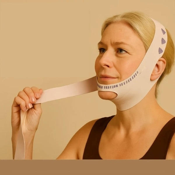 Compresia ușoară ascendentă ajută la reducerea umflăturilor și la definirea liniei maxilarului în timp.
