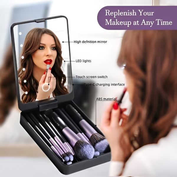 Cu acest set de pensule de machiaj și oglindă LED, bucurați-vă de ușurința aplicării machiajului impecabil oriunde v-ați afla, făcându-l partenerul ideal de călătorie.