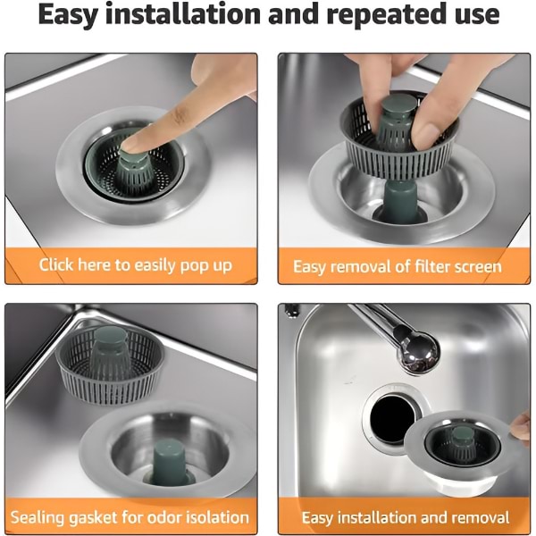 Această soluție completă funcționează ca sită, dop și filtru de mirosuri—menținând chiuveta curată, uscată și fără mirosuri neplăcute.